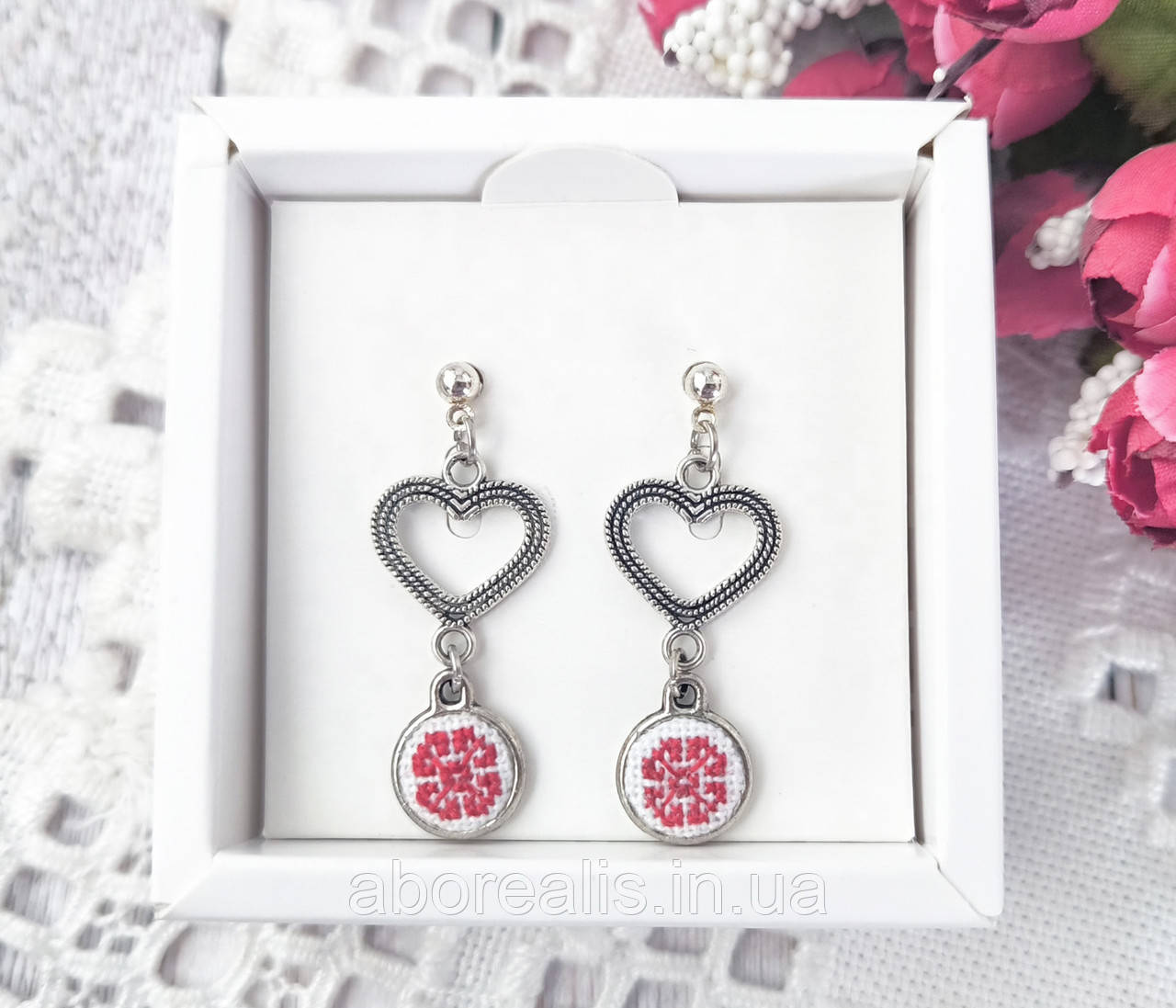 Розмір сережки 43*14 мм, розмір вставки з вишивкою – діаметр 7 мм.